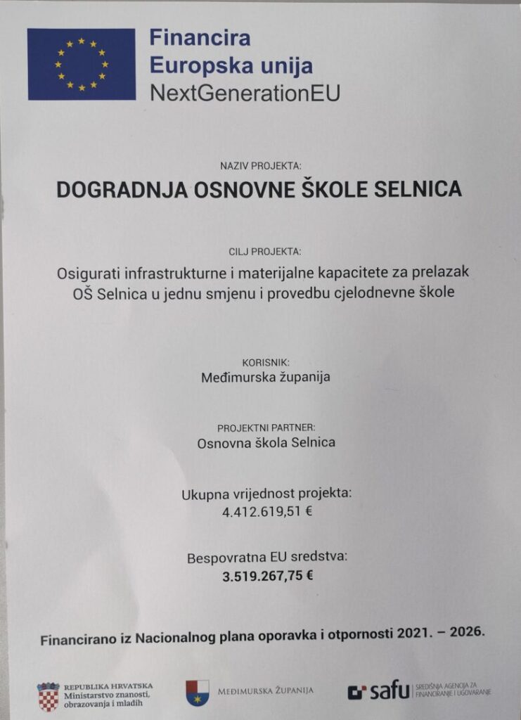 Zbog početka izvođenja radova na dogradnji i rekonstrukciji Osnovne škole Selnica, a s ciljem osiguravanja sigurnih uvjeta tijekom izvođenja radova, od 21. siječnja 2026.  UVODE SE IZMJENE KOJE UKLJUČUJU ZABRANU PARKIRANJA, prometovanja i zaustavljanja u blizini škole.